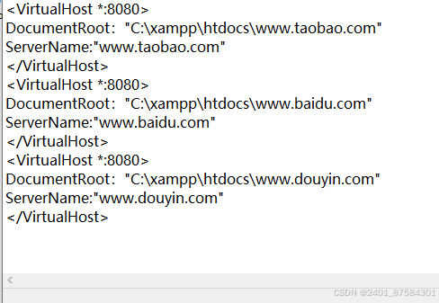 在XAMPP安装目录下,找到apache\conf\extra\httpd-vhosts.conf文件(路径为C:\xampp\apache\conf\extra\httpd-vhosts.conf)。
